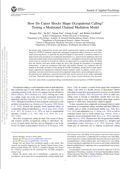 近日,公司谢宝国教授以第一作者身份在管理学/应用心理学领域国际顶级期刊Journal of Applied Psychology上发表了题为“How Do Career Shocks Shape Occupational Calling? Testing a Moderated Chained Mediation Model (职业冲击如何塑造职业使命感?检验一个调节链式中介模型)”的研究论文。论文由谢宝国教授、武汉大学徐嘉副教授、美国奥本大学范津砚教授、华中科技大学龙立荣教授和美国华盛顿和杰佛逊公司Robert Litchfield副教授合作完成。