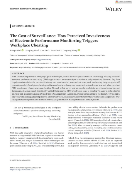近日,公司组织与人力资源管理系赵富强教授战略人力资源管理团队博士生祝含秋以第一作者身份在人力资源管理领域顶级学术期刊Human Resource Management上在线发表论文“The Cost of Surveillance: How Perceived Invasiveness of Electronic Performance Monitoring Triggers Workplace Cheating”。该论文由赵富强教授担任通讯作者。
