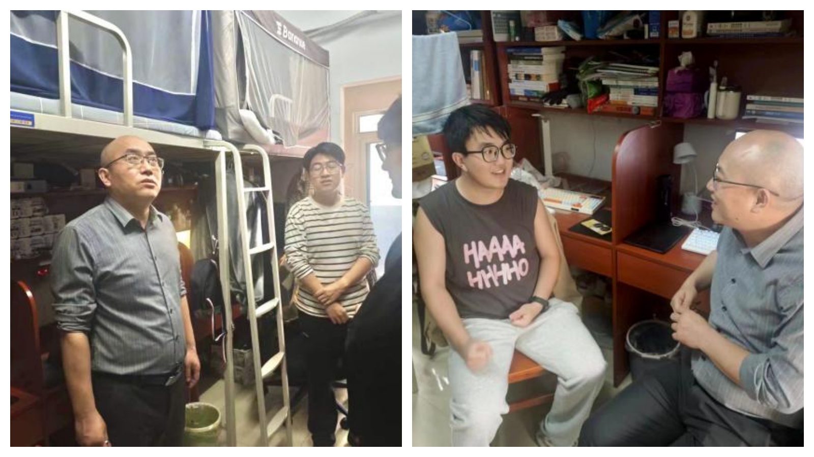 牟老师详细询问员工的宿舍关系、作息习惯与锻炼情况,关心员工们的生活起居与未来打算。交流过程中,牟老师分享了自己的求学过往与宿舍经历,鼓励团队员工在生活上珍惜情谊、在科研时默契协作、在发展中互促互进。根据员工的专业方向,牟老师在宿舍现场开展学术指导,鼓励员工优化学科知识结构、提升科研创新精神、涵养良好科研道德,结合专业前沿与社会所需,做真正有意义的科研。导学团队师生围坐一起,在轻松和谐的氛围中收获知识、共话成长。