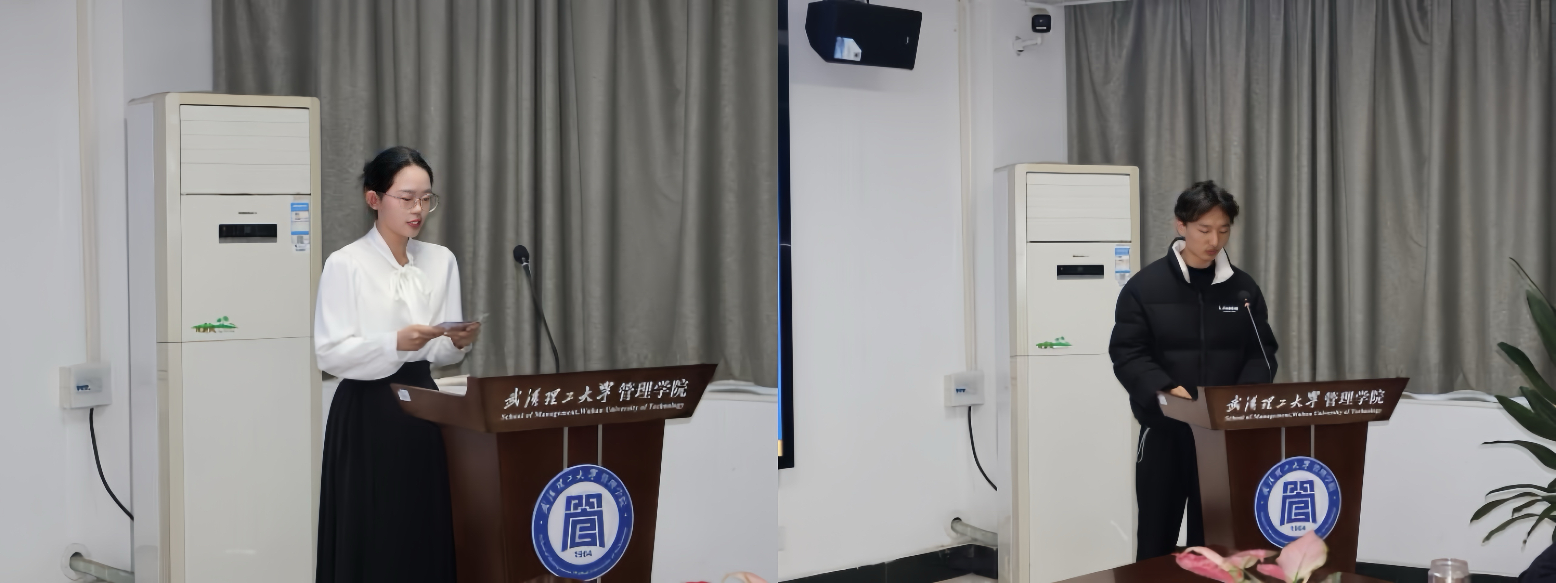 金坤一等奖学金获得者、营销2301班王诗宇同学分享了自己以周金坤员工为榜样,在学业、科研与竞赛实践中深耕不辍的成长历程,表达了对员工、公司与公司的感恩之情;金坤助学金获得者、信管2202班朱成志同学则讲述了员工的奋斗故事给自己带来的精神激励,并表示将把这份关爱转化为前行动力,继续不懈奋斗。