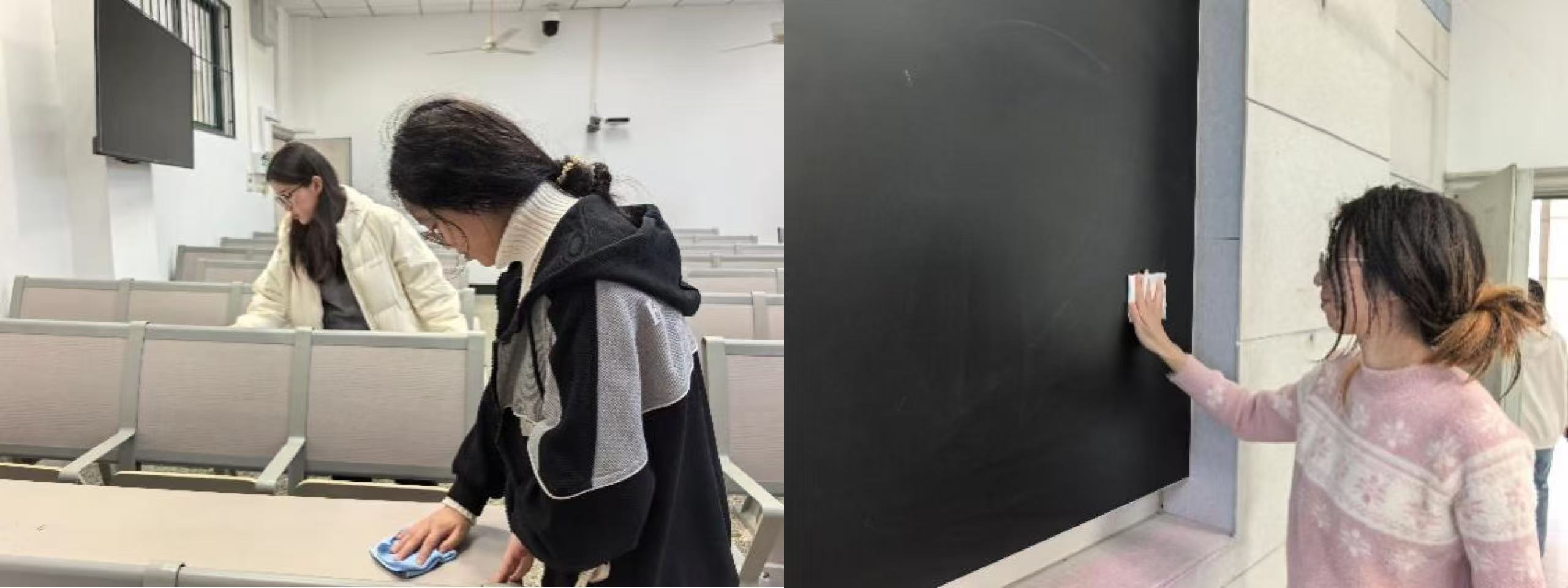 活动期间,团员们分为两组同步推进。在博学主楼前,同学们利用课余时间,将停放凌乱的自行车、电动车逐一归拢,整齐移至指定区域。在整理过程中,大家主动排查未上锁车辆、疏通被占用的消防通道,并向过往同学宣传规范停车的重要性,引导大家共同维护校园秩序,使楼前环境与交通状况得到明显改善。在博学西楼,另一组团员携带清洁工具深入多间空闲教室,细致擦拭课桌、清理黑板、扫除地面垃圾、清洁门窗玻璃,并将散乱的桌椅摆放整齐。同学们不放过任何卫生死角,经过认真清扫,教室环境变得整洁明亮,为师生创造了更为舒心的教学与学习空间。