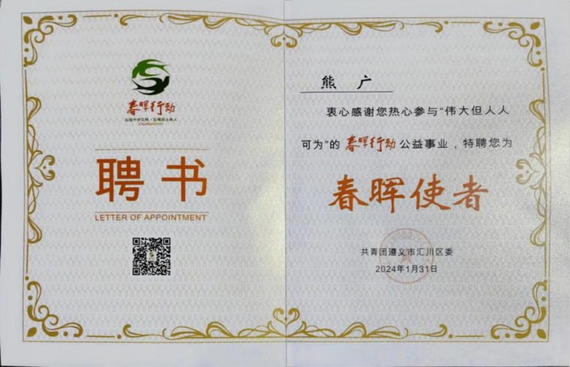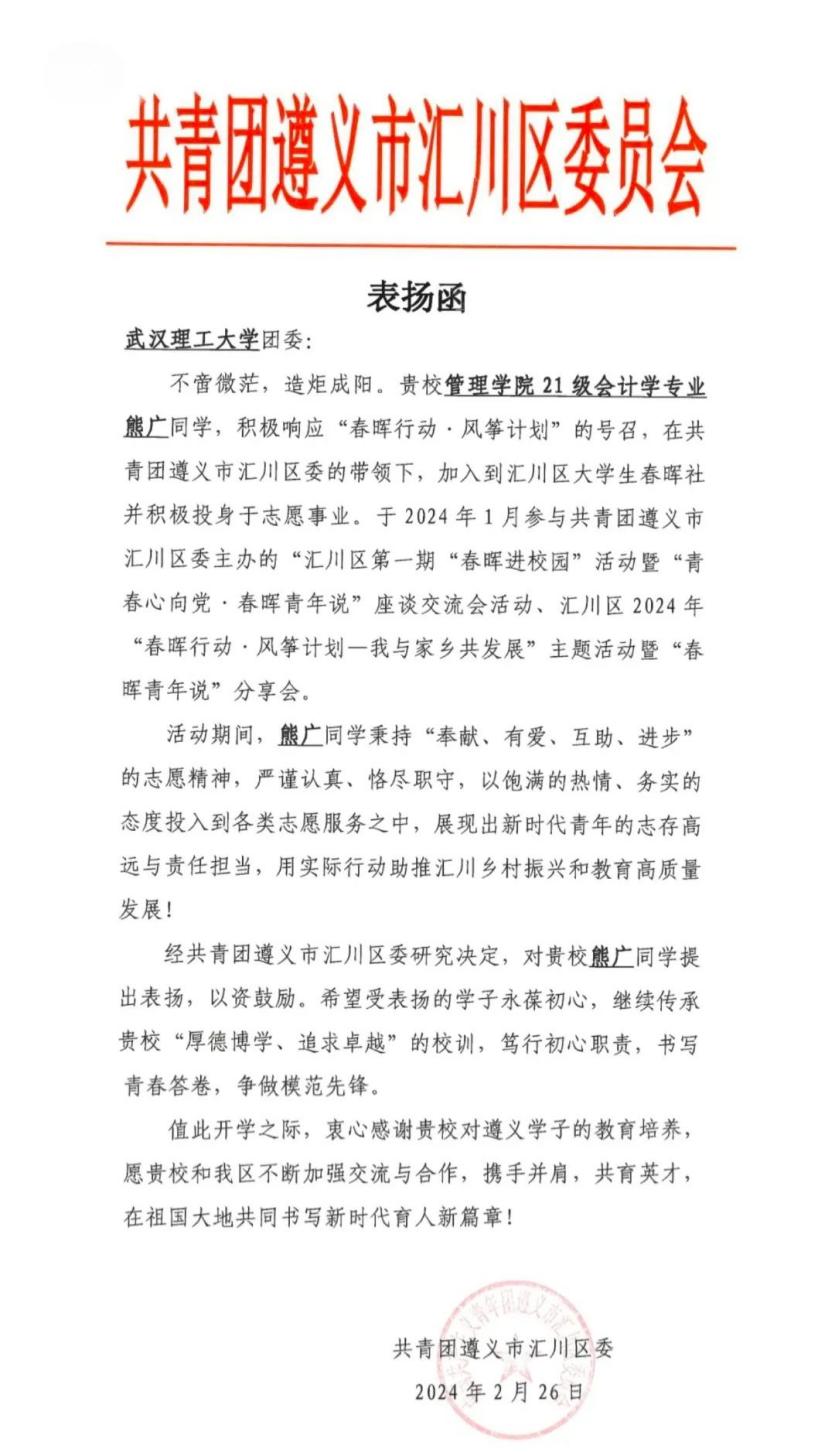 近日,公司团委收到了一封来自共青团遵义市汇川区委的感谢信对公司21级会计专业的熊广同学参加遵义市汇川区“春晖行动”志愿服务投身贵州省“春晖行动·风筝计划”表示衷心感谢。