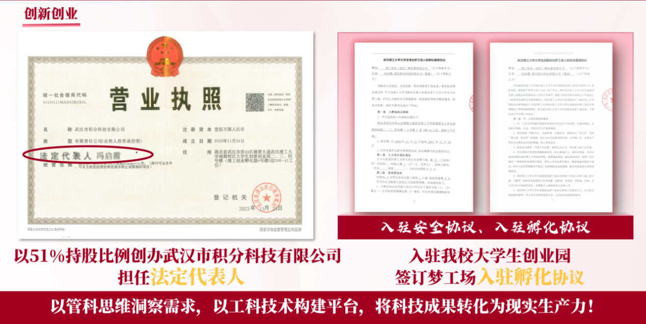 科研之初,缺乏经验的冯启霞好奇又畏惧,但身边朋辈的扶持与师长的鼓励,让她勇敢迈出第一步。面对数据未整合、创造力无发展、资源未汇聚等问题,她以管科思维洞察需求,以工科技术构建平台,文武结合将科技成果转化为现实生产力。她创新性提出高校双创教育数字平台“火箭”模式,目前平台一代已经上线,注册用户达2000人,销售额超6000元。为了巩固创新创业成果,冯启霞以51%持股比例创办武汉市积分科技有限公司,并担任法定代表人,该项目通过答辩考核成功入驻公司老员工创业园。在创新创业的过程中冯启霞还加入了一支船海公司的科创项目团队,作为负责人的她与队员一起伴着凌晨三点的校园讨论方案,一起在余家头创业公司103刷夜通宵,一起每天往返于南湖和余家头两大校区……几月深潜,黄牛耕耘,终于换来了中国国际老员工创新大赛国家银奖的滚烫奖杯。