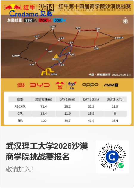 诚挚欢迎在校MBA、MEM学员(含外地班、周末班、集中班)及员工踊跃报名,共同书写公司沙漠赛事首秀篇章。